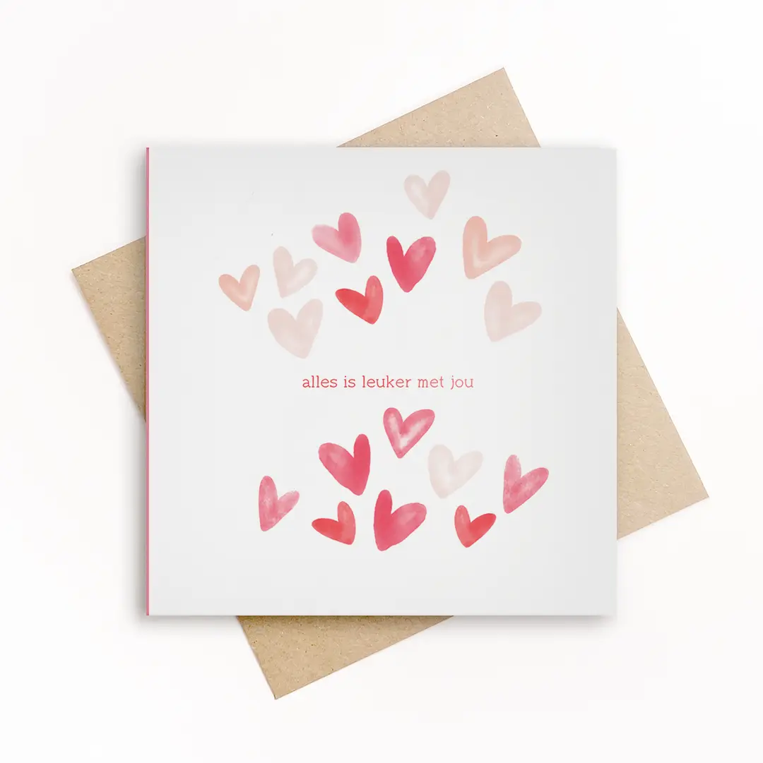 De losse hartjes geven beweging en speelsheid, terwijl de rustige opzet ruimte laat voor jouw eigen woorden. Een kaart voor liefde, vriendschap of die ene persoon die jouw dagen kleur geeft.