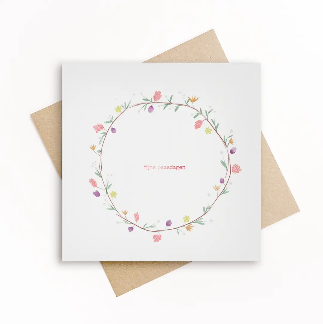 Lenteachtige paaskaart met fijne bloemenkrans en zachte pastelkleuren. Een verfijnde en frisse paasgroet.