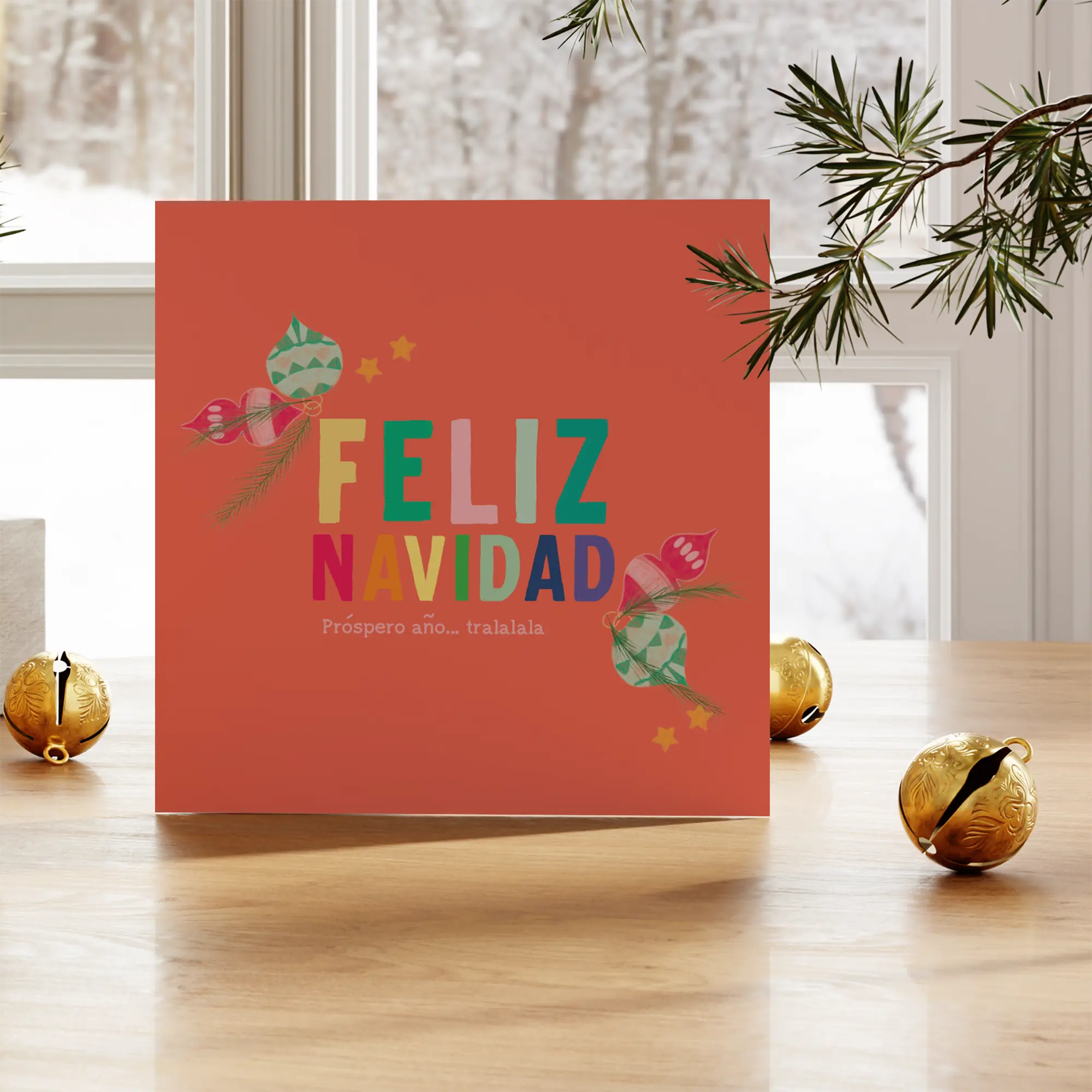 Een vrolijke kerstkaart met een heldere oranje achtergrond en de tekst ‘Feliz Navidad’ in kleurrijke letters. Onder de hoofdtekst staat ‘prospero año… tralalala’, een kleine knipoog naar het bekende lied dat iedereen half kent en vervolgens vrolijk verder improviseert. Deze kaart brengt precies die speelsheid en herkenning mee.