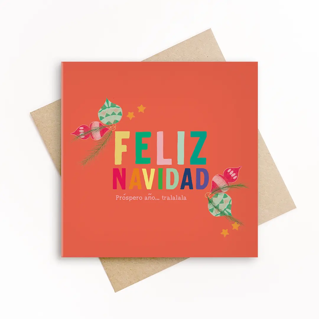 Een vrolijke kerstkaart met oranje achtergrond en kleurrijke ‘Feliz Navidad’, met daaronder het knipoogje ‘tralalala’. Versierd met kerstballen, sterren en dennetakjes. Duurzaam gedrukt, 15 x 15 cm, inclusief kraft envelop.