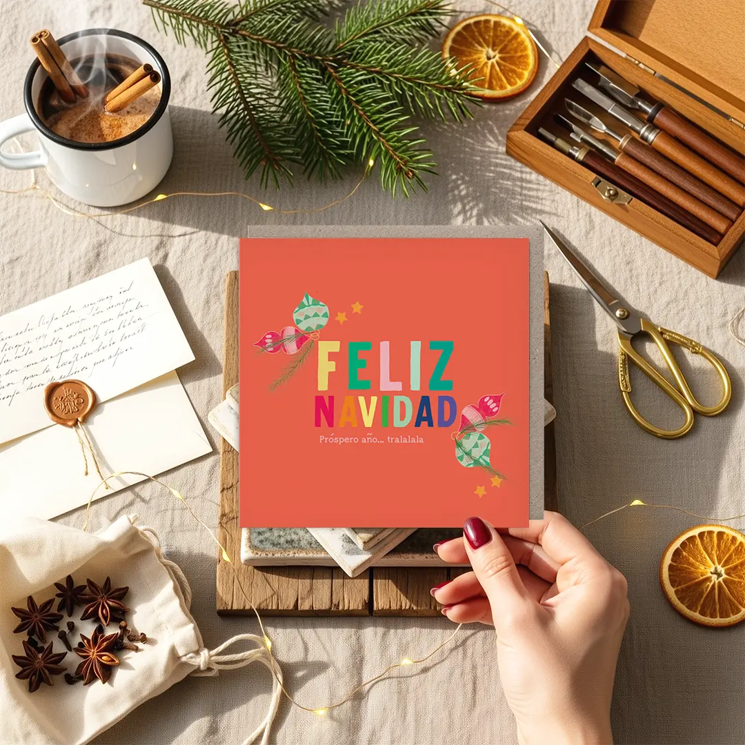 De oranje achtergrond maakt de kaart warm en energiek. De meerkleurige letters van ‘Feliz Navidad’ springen er vrolijk uit, terwijl de roze ‘tralalala’ een zacht accent toevoegt. De kleine ornamentjes zorgen voor een feestelijke, luchtige kerstsfeer.