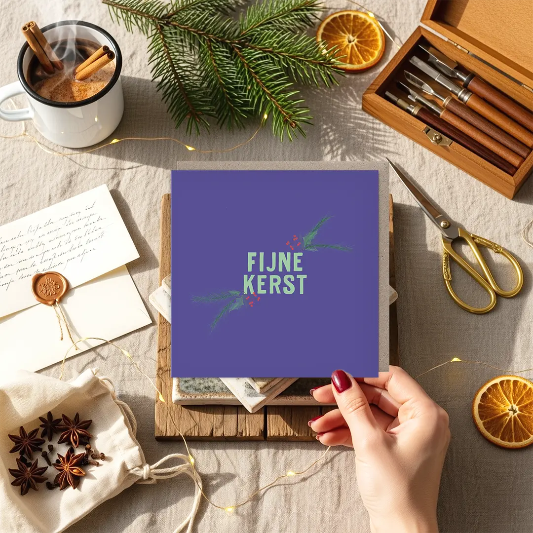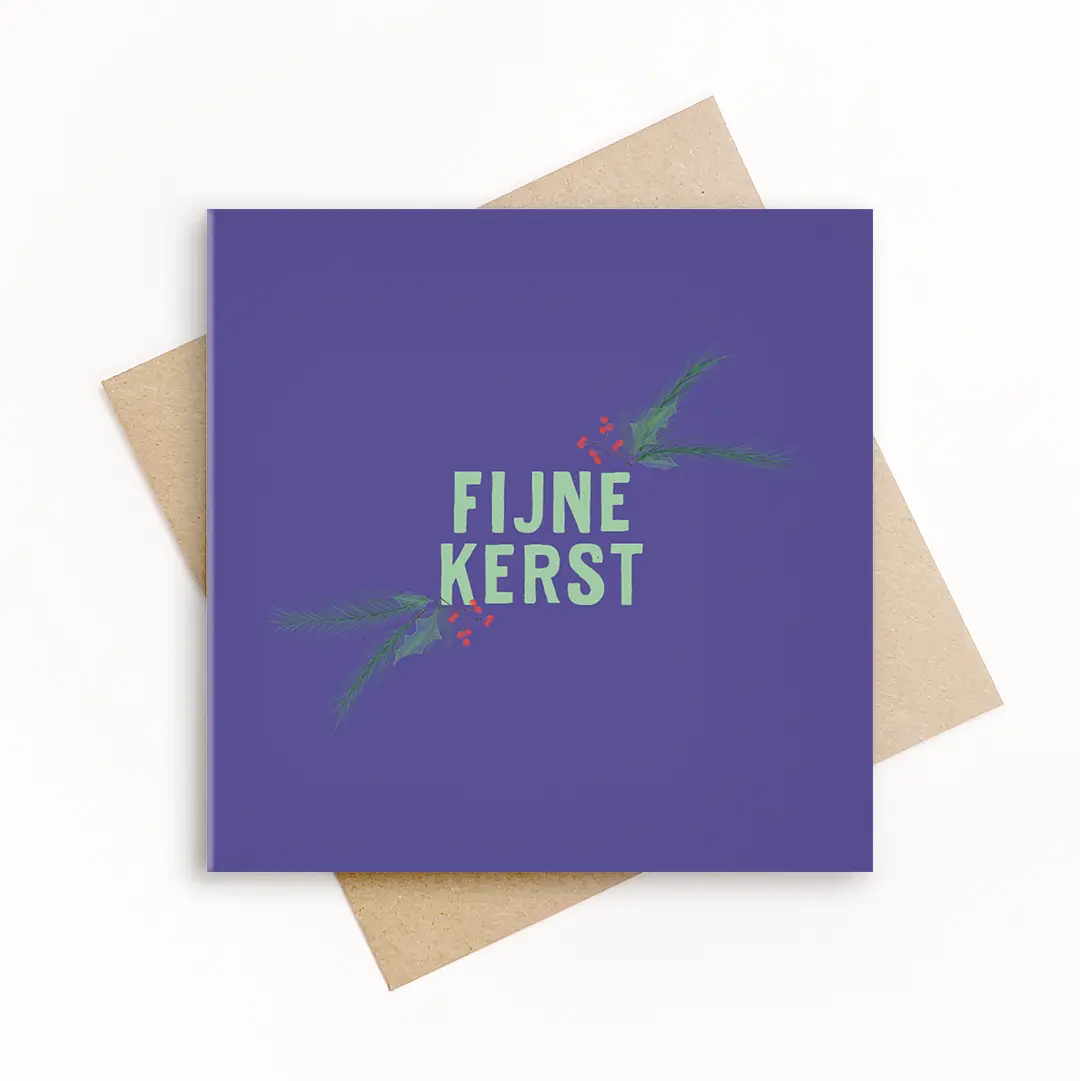 Een kerstkaart met diepe paarse achtergrond en mintgroene tekst ‘Fijne kerst’, aangevuld met eenvoudige kersttakjes en besjes. Duurzaam gedrukt op stevig papier, 15 x 15 cm, inclusief kraft envelop.