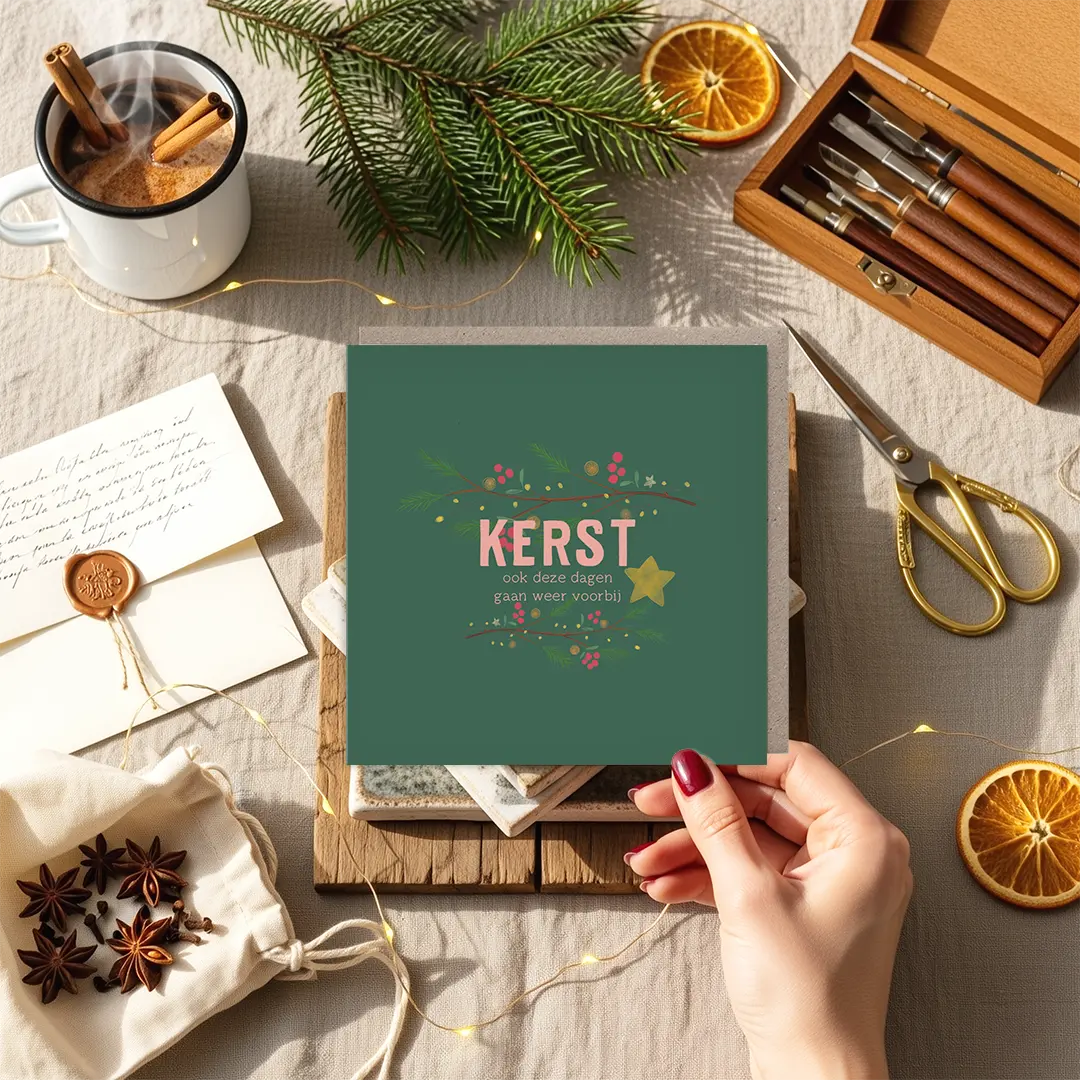 Een eenvoudige, warme kerstkaart voor wie deze periode niet vanzelfsprekend licht of vrolijk beleeft. Of gewoon helemaal niet van de kerstdagen houdt. De kersttak met kleine winterse details geeft de kaart een rustige kerstsfeer, terwijl de tekst ‘Kerst, deze dagen gaan ook weer voorbij’ ruimte biedt aan alles wat december soms lastig maakt.