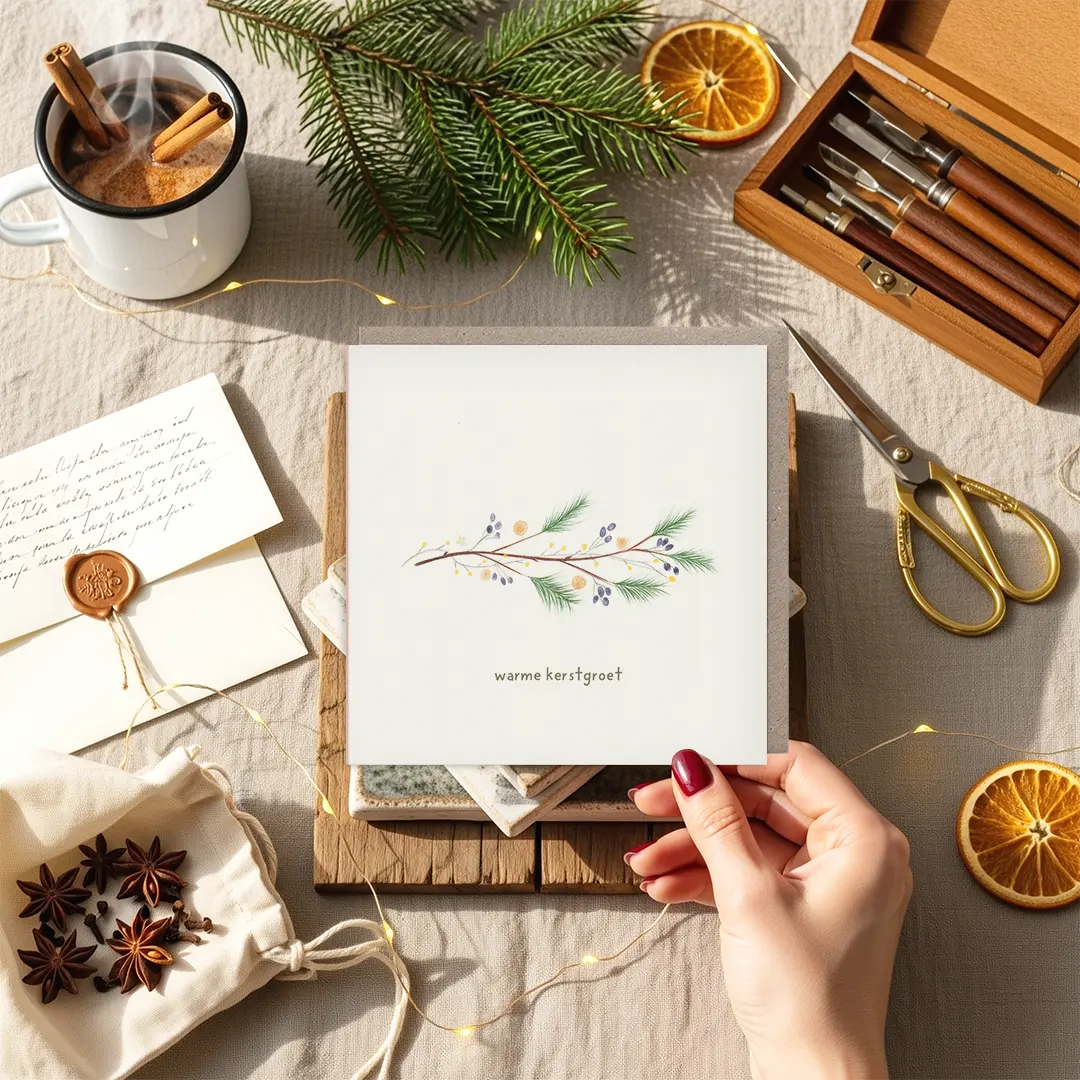 De horizontale tak vormt de basis van de illustratie, aangevuld met kleine kerstdetails en zachte blauwe besjes. De combinatie van natuurlijke elementen en een rustige kleurstelling maakt dit een fijne kaart om te versturen in de decembermaand.