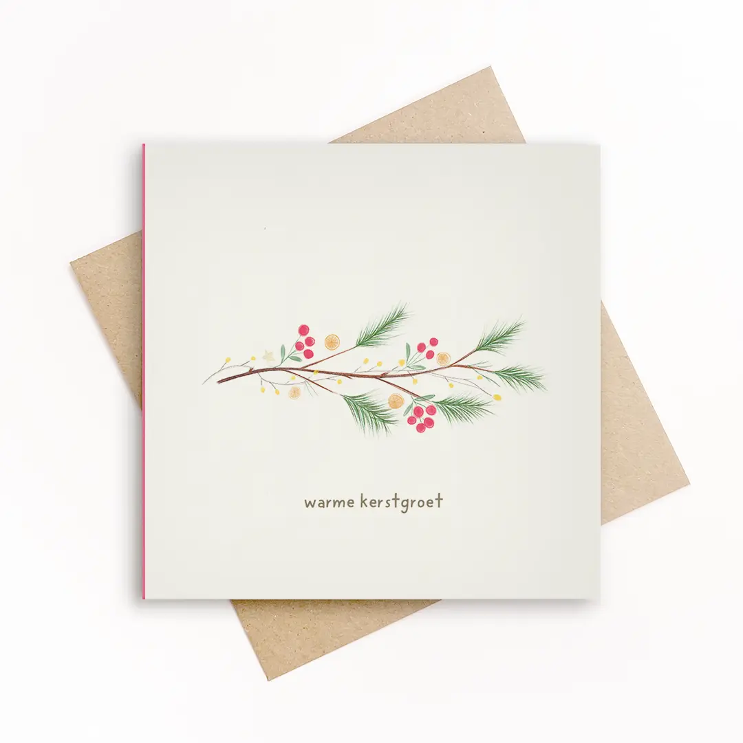 Een fijne kerstkaart met een horizontale tak, rode besjes en kleine kerstelementjes. De binnenzijde is subtiel geïllustreerd en vrij van tekst. Duurzaam gedrukt op stevig papier, 15 x 15 cm, inclusief kraft envelop.