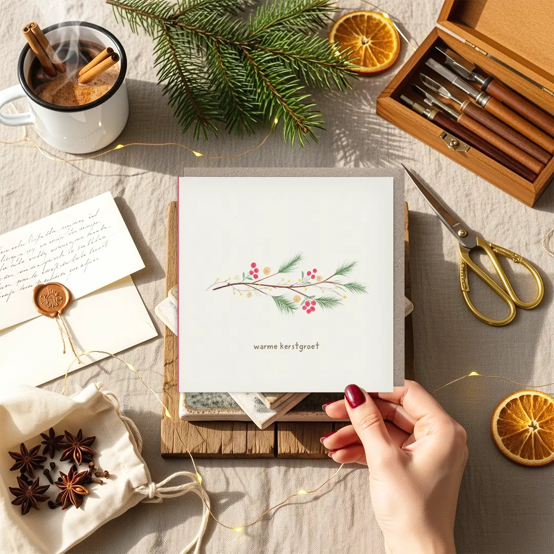 De kaart is gedrukt op stevig, duurzaam papier en heeft een subtiel geïllustreerde binnenzijde zonder tekst, zodat jouw eigen woorden de ruimte krijgen. Door de combinatie van natuurlijke elementen en warme kleuraccenten is deze kaart geschikt voor iedereen die je iets liefs wilt sturen in december.