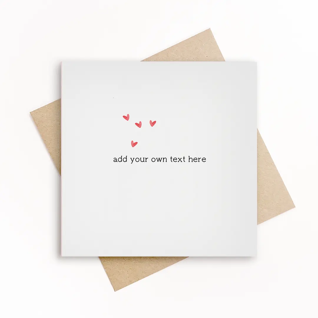 Deze kaart is ontworpen om persoonlijk te maken. De subtiele rode hartjes geven het gevoel, jij bepaalt de boodschap. Laat een tekst op de voorkant drukken of schrijf hem zelf met de hand.