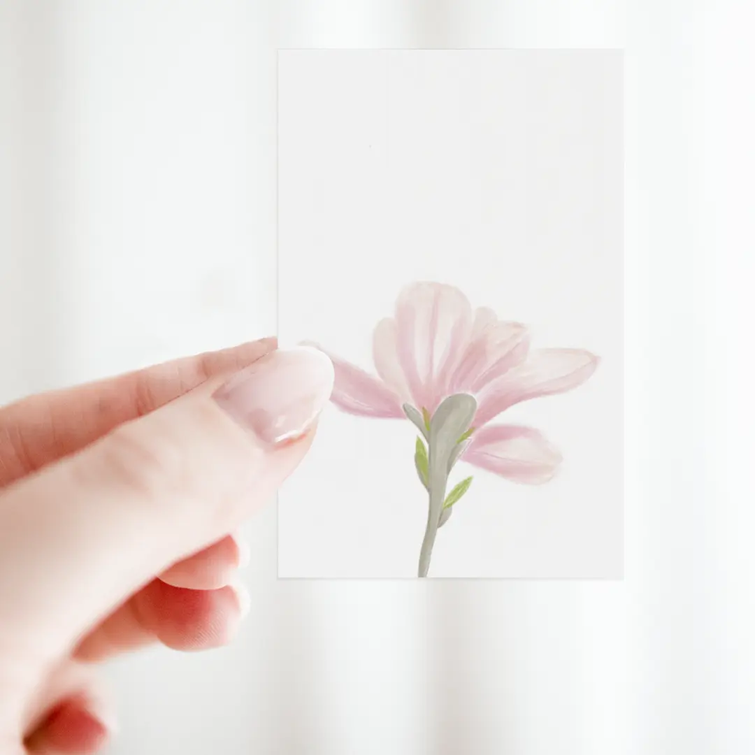 Dit bloemenkaartje met roze magnolia straalt rust uit. De bloem is los en luchtig geïllustreerd, met subtiele schaduwen en een lichte transparantie in de bloemblaadjes. Een kaartje dat je niet hoeft te overdenken, het staat er, helder en elegant.