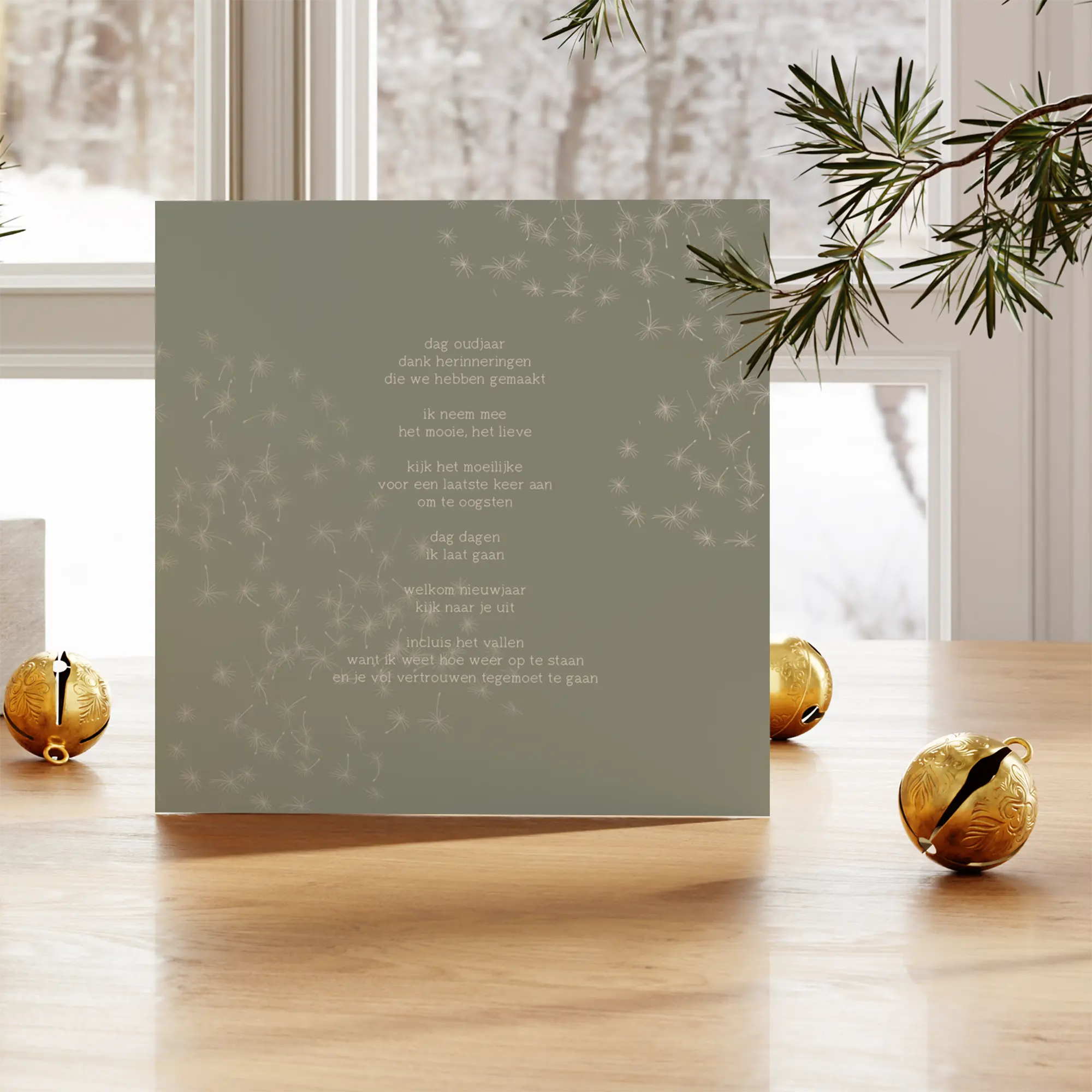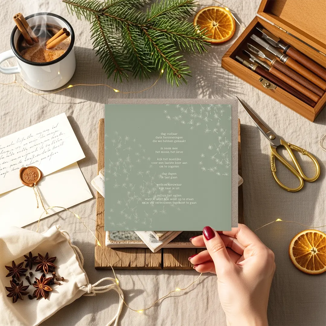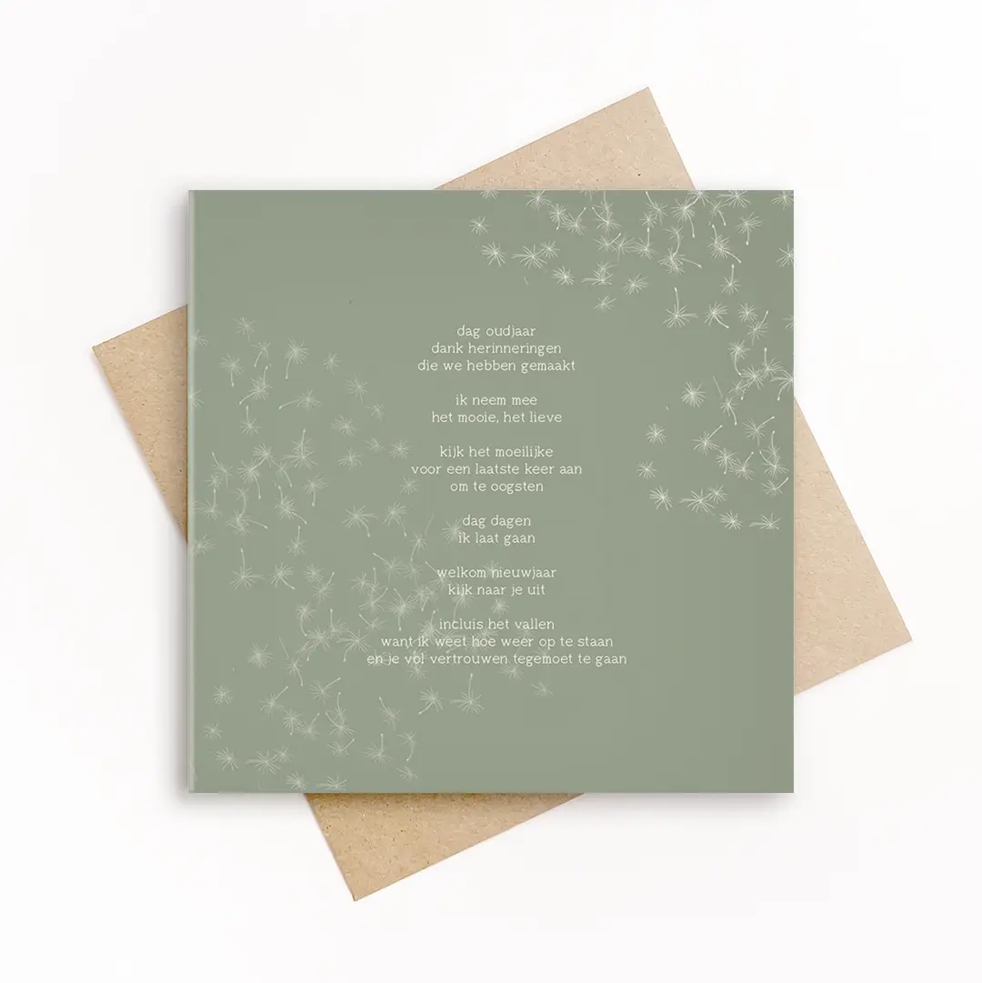 Een rustige en bemoedigende nieuwjaarskaart met een saliegroene achtergrond en een tekst die het jaar afrondt op een zachte manier. De woorden nemen je mee langs herinneringen, afscheid en vooruitkijken. Een kaart voor iedereen die even stil wil staan bij wat was, en met vertrouwen het nieuwe wil verwelkomen.