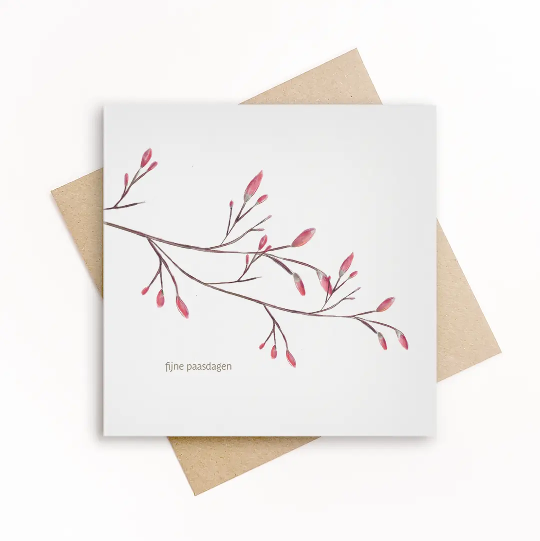 Een rustige wenskaart met een verfijnde illustratie van een tak met bloesem in de knop. De zachte roze tinten en de open compositie geven de kaart een lichte, frisse uitstraling. Een ontwerp dat past bij het voorjaar en bij momenten waarop je iemand iets zachts en oprechts wilt sturen.