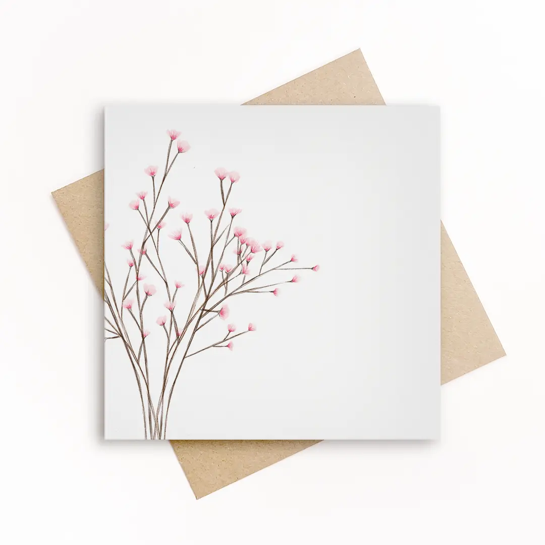 Deze illustratie van fijne takken met kleine roze bloesemknopjes voelt als het begin van het voorjaar. De open compositie en de royale witruimte geven de kaart een stille elegantie.