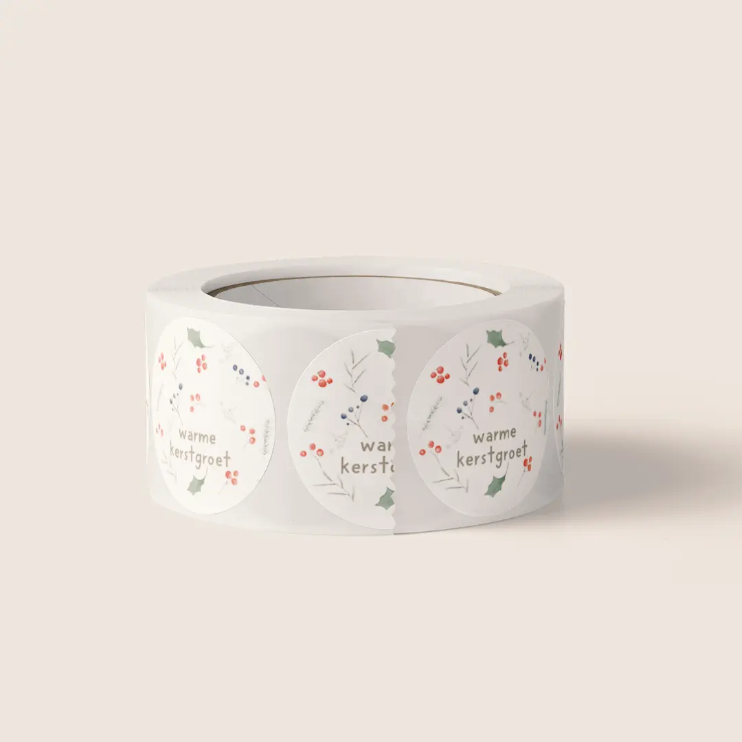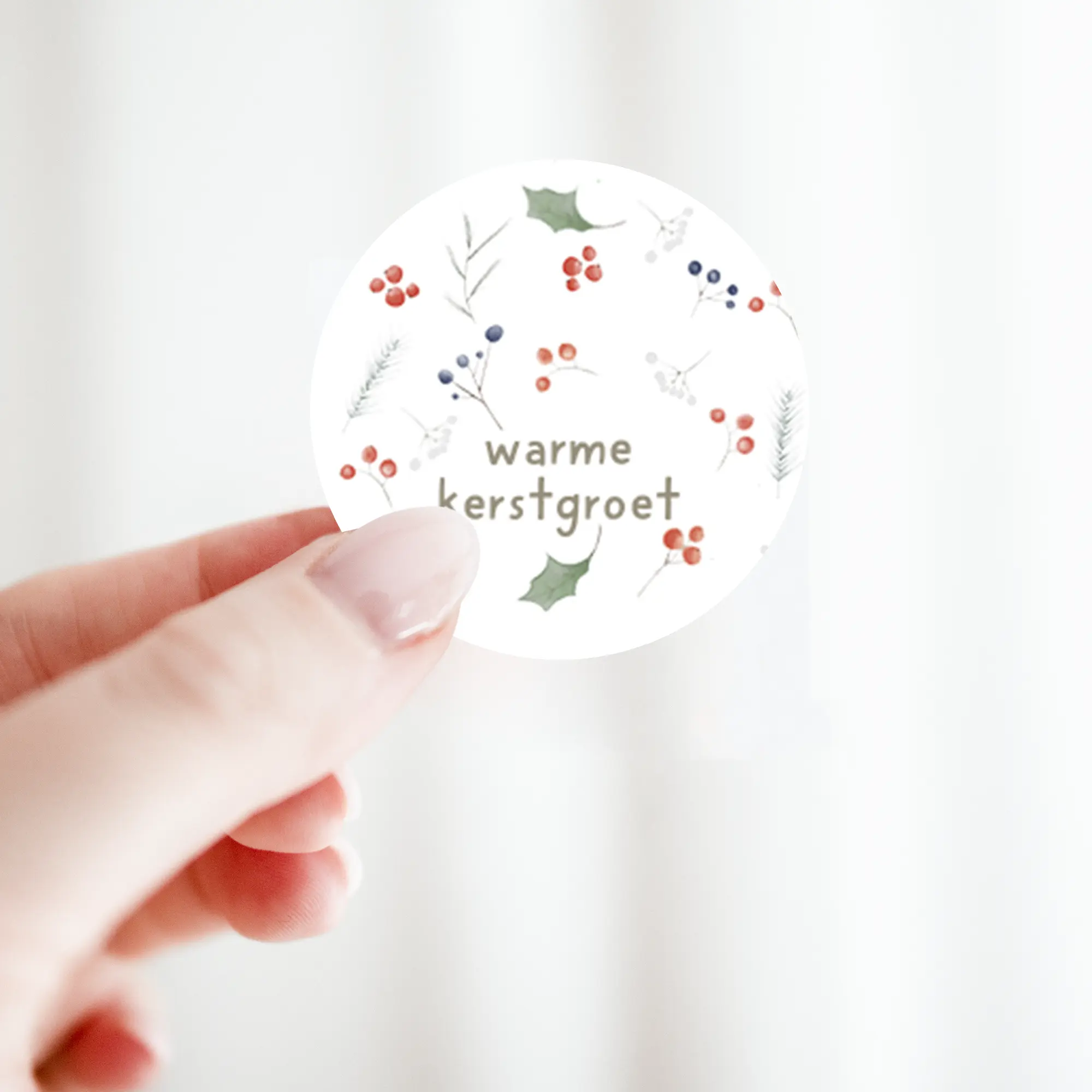 Een charmante kerststicker met een speelse en warme uitstraling. De prachtige mix van rode en blauwe besjes, dennetakjes en hulst creëert een gezellige, natuurlijke sfeer. Perfect om je cadeaus en bestellingen op een feestelijke manier af te maken. De tekst “Warme Kerstgroet” springt in het oog en maakt de sticker ideaal voor winkels die tijdens de kerstperiode een zachte, maar stijlvolle uitstraling willen neerzetten.