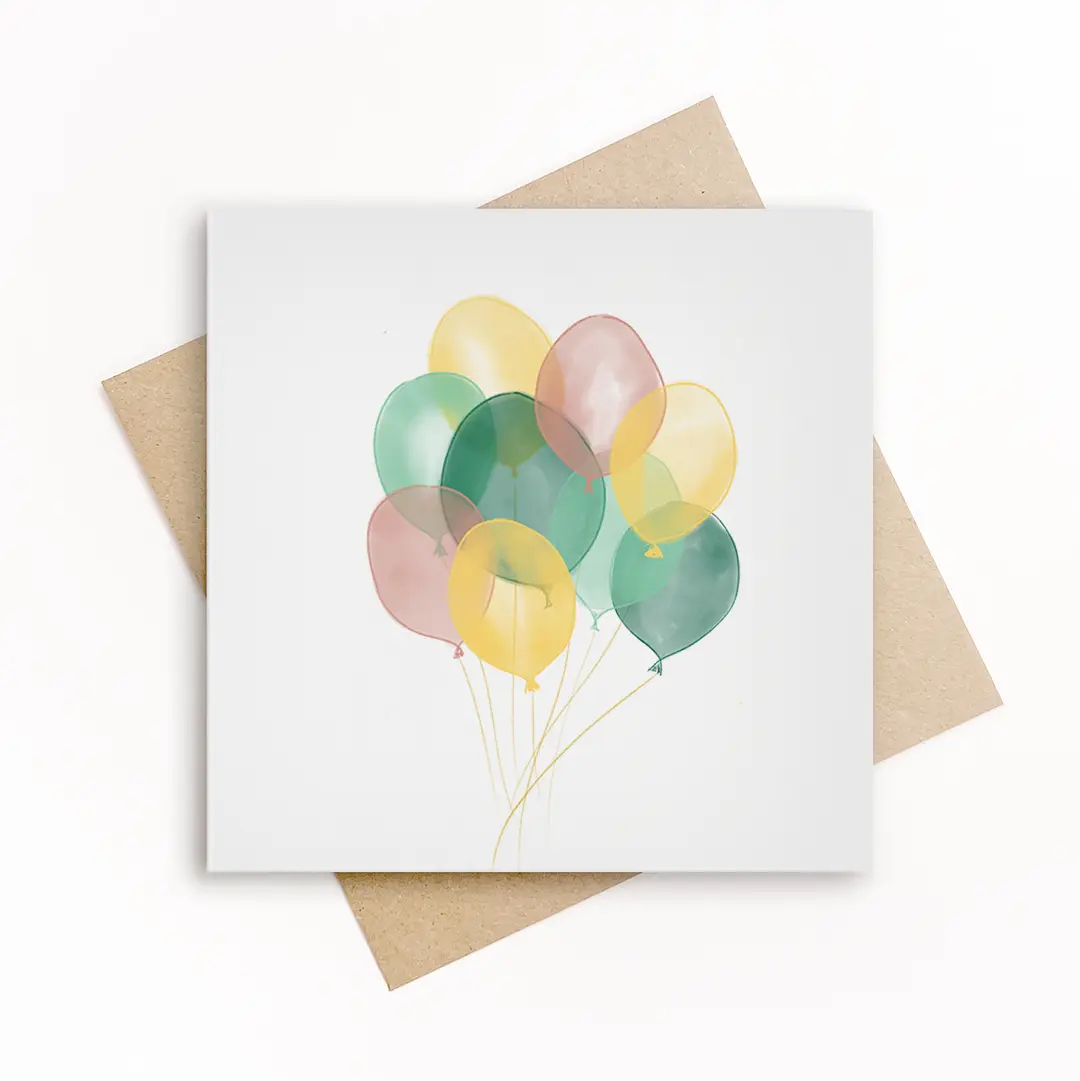 Een lichte, feestelijke wenskaart met een illustratie van ballonnen in zachte groentinten, geel en roze. De transparante vormen overlappen elkaar subtiel en geven de kaart een speels, luchtig karakter.
