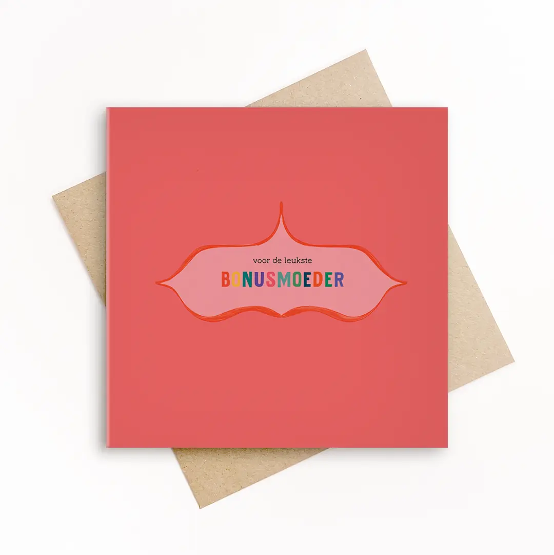 Een warme wenskaart voor een bonusmoeder die een bijzondere plek inneemt. De vrolijke kleuren en de speelse typografie maken de kaart licht en persoonlijk, zonder overdreven te zijn.
